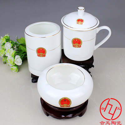会议茶杯三件套包括陶瓷茶杯、陶瓷笔筒、陶瓷烟灰缸组合,景德镇合元生产的会议茶杯三件套定制办公用品采用优质骨质瓷,骨质瓷瓷色泽呈乳白色,光泽柔和,温润如玉,采用景德镇传统工艺经过其千度的高温烧制。会议茶杯三件套定制现货画面有 水点桃花图案、兰牡丹、墨竹、描金国徽、国色天香、白雪景等图案可以在现有的图案上印制LOGO、纪念文字。