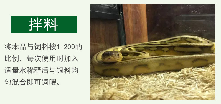 2,改善肠道功能,增加免疫力。促长剂在蛇的体内繁衍,可以增加有益菌群优势,抑制有害菌的生长速度,减少体内的毒素的产生,调节体内菌群平衡,增加机体免疫力,增加抗病力和成活率。
