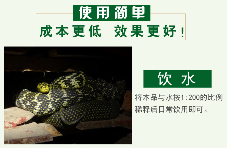 将促长剂活化液以1:200的比例兑水稀释,喂蛇日常饮用即可,长期使用预防蛇类肠道疾病,提高蛇苗成活率以及蛇肉品质,加快蛇催肥生长,产品是纯复合型益生菌制剂,对蛇没有伤害和副作用。
