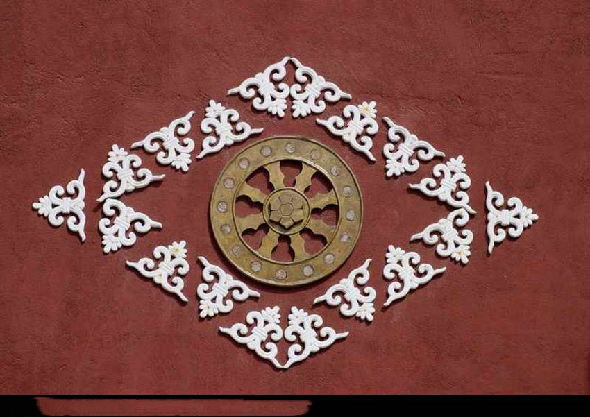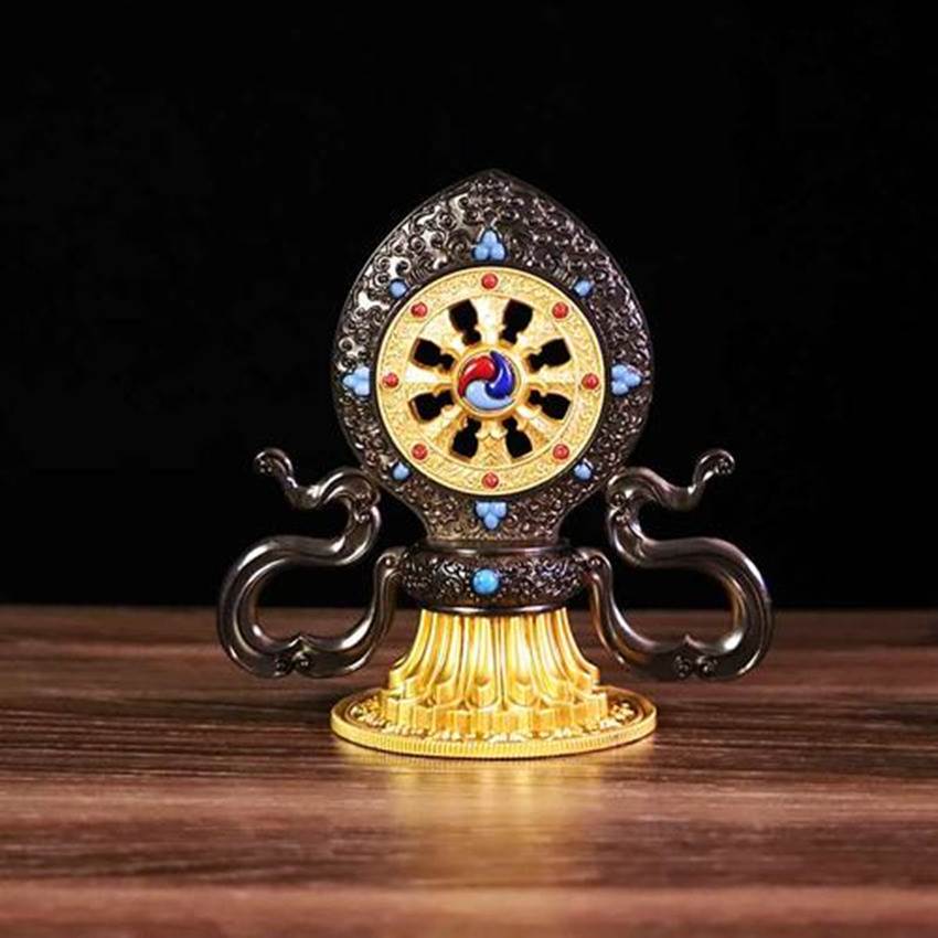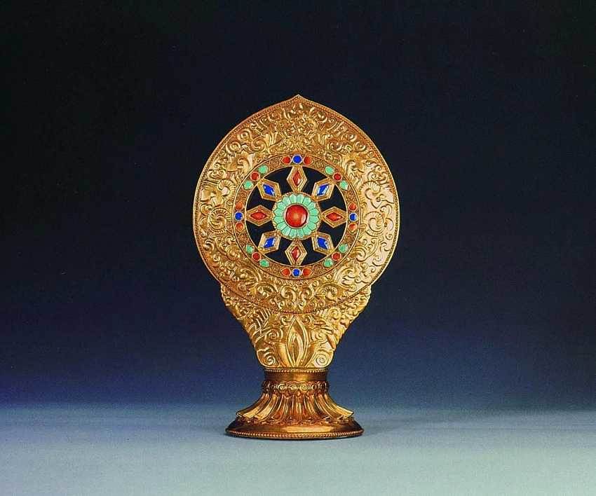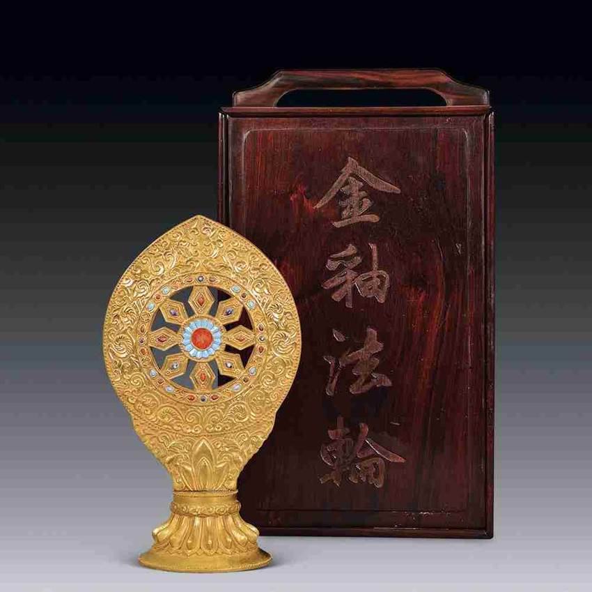 法轮是藏传释教常用的一种法器,轮上的八条梁象征八道循环,是指导众生到达至善的八条蹊径。法轮还象征勇猛精进,无坚不摧。法轮通体镀金,下端为覆莲式底坐,轮略呈鸡心状,外框饰浮雕卷云纹,内框嵌一圈宝石,中央透空,中央圆向外辐射八条梁,圆心和梁均嵌宝石。