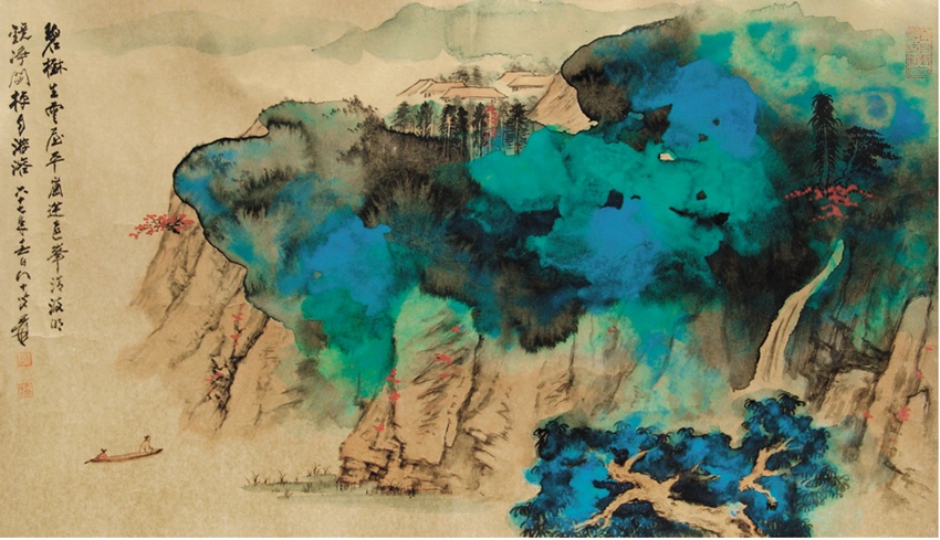 张大千字画真虚分辨,要凸现色彩,笔墨必须有所退让,否则便会破坏色彩的纯度与亮度。这与唐人大青绿山水、宋元以来小青绿山水有所不同——前者的要义在于空勾无(少)皴,色重且亮,故少用笔;后者在于色不碍墨、墨不碍色,努力在色与墨间求得平衡,其优点是保留笔墨的表现力,但色彩的鲜亮与厚重度却不得不退而求其次,此亦晋唐著色画与宋元水墨画的根本差异。正是缘此,张大千的重彩山水画,特别具有唐画重平面、喜勾勒的特色。也正是缘此,张大千在此图完成后写下了一段非常有意思的题识,兹录如下:
