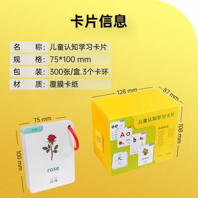 字卡300张, 自带有圈订的小孔和一个大号的装订圈。让字卡在日常使用中,不容易散落、遗失。外出就餐等位,旅途中的碎片时间,都可以利用字卡来玩一些互动游戏。